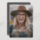 A simple classic script "graduate" in white accentuates a single vertical photo of your grad. This graduation announcement works for both college or high school graduates and is simple enough to let your photo shine. It's a timeless design and also features a striped backer with a customisable colour (default is charcoal grey).