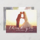 No "postcard" word on the back of card. Place two photos on your wedding thank you cards, one on the front and a second photo on the back. Send out your wedding thank you message as newly weds to your friends and family using this beautifully, simple thank you wedding photo postcard with the words "thank you" written in a white handwriting script text overlay. Wedding Thank You Postcards with Your Photo. Design by Elke Clarke© . Replace the sample photo with your own. Add your personal thank you message on the back or leave blank and hand write your message in person. Other colours available.