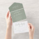 Modern wedding invitation featuring your monogram initials, names, and wedding details in a simple white script with a sage green background. The sage green all-in-one wedding invitation includes an RSVP postcard.