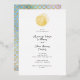 Simple Seashells in gold foil with calligraphy and classic fonts on simple front invitation. Reverses to sea colours of watercolors overlaid with mermaid fish scales in a faux golden effect.