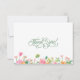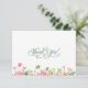 Simple and sweet typography script, "Thank you!" with swashes in medium green. Although you may change the colour however you like with the Edit button. At the bottom border, a watercolor illustration of flowers; pinks, orange, yellow, and greenery. White background front and back. Perfect for a garden bridal shower, tea party, or birthday.
