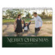 This simple, stylish photo calendar features elegant typography reading, "Merry Christmas" in ivory over a custom colour background (shown in dark green). A text template is included for easy personalisation. The back contains a hand drawn floral pattern in traditional Christmas colours of deep green, red, and ivory over a sand beige coloured background.