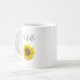 Personalized Simple Sunflower coffee mug with a white background. Black Script typography lettering can be customized with your own text. An elegant country floral item for enjoying your favorite hot beverage.