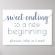Trendy smoky denim blue and white horizontal "Sweet Ending to New Beginning" shower, party, or reception table signage featuring a fun, casual hand-lettered script. The classic design includes a modern handlettered quote typography overlay. The lovely font with a customizable background color makes it easy to fit any theme. For other colors or matching products, please visit the JustFharryn Zazzle store, or contact the designer, c/o fharryn@yahoo.com All rights reserved. #zazzlemade