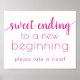Playful 1980s inspired ultra bright bubblegum pink and fuchsia rose flourish calligraphy horizontal "Sweet Ending to New Beginning" shower, party, or reception table signage featuring a fun, casual hand-lettered script. The classic design includes a modern handlettered quote typography overlay. The lovely font with a customisable background colour makes it easy to fit any theme. For other colours or matching products, please visit the JustFharryn Zazzle store, or contact the designer, c/o fharryn@yahoo.com All rights reserved. #zazzlemade