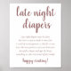 Fun way to give new parents advice and laughs with this vertical late night diapers well wishes table sign: Simple shower or gender reveal party flourish calligraphy sign featuring a fun, casual hand-lettered script. The classic design includes a modern handlettered quote typography overlay with poem. For other colors or matching products, please visit the JustFharryn Zazzle store, or contact the designer, c/o Fharryn@yahoo.com All rights reserved. #bohochic #zazzlemade