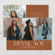 Modern and elegant graduation announcement photo card featuring 3 photos on the front and 1 on the back. The text says "THANK YOU." Add the graduate's name, information, and message to personalise this card. Terracotta colour.