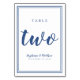 This design was created for smaller intimate wedding celebrations. Simple, minimalist and elegant Wedding Table Number TWO design features a contemporary design with a double frame border in Classic Blue on a crisp white background. The chic design provides timeless yet modern sophistication. Personalise wedding table design with your wedding details in sophisticated blue lettering and script. The back of the card is a duplicate of the front. Order one for every table with the individual table numbers.