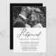 Elegant change the date wedding postponement announcement. This simple announcement is a chic way to let invited guests know that your wedding date has been rescheduled due to unforeseen circumstances, and includes the new wedding date. This trendy announcement features beautiful "postponed" black calligraphy script on a white background with the couple's photo, and a black back of the card.