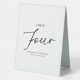 Wedding table number tent sign featuring a simple white background that can be changed to any colour, the table number "four" in a elegant script font, the couples names, and the date.