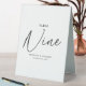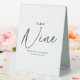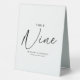 Wedding table number tent sign featuring a simple white background that can be changed to any colour, the table number "nine" in a elegant script font, the couples names, and the date.