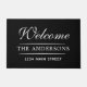 Modern & elegant custom doormat. This Design features white text "Welcome" in calligraphy script writing with family's last name , your home's street address and simple horizontal divider line accents.