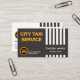 In a black cover, six vertical white stripes fill the right face of the card. A cut-off in the lines houses your prestigious name and job title. Over at the top is an oversize yellow slogan "CITY TAXI SERVICE" which you can change. Near the base are the yellow taxi logo alongside the contact details.