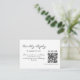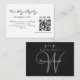 A beautiful personalised and custom Simple Yet Elegant: Black & White with Monogram Wedding Invitation. A wedding enclosure card that directs your guests to your wedding website where they can RSVP and find all your wedding details plus a QR Code sample photo for more convenience, that you can easily replace and customise. Easily change all the current details. Trendy and chic yet elegant and timeless - coordinates beautifully with so many of today's wedding styles so feel free to customise & personalised with your wedding text. The design features the bride and groom's names in an elegant script with plain text font. Shown in a black and white theme with a black linen cloth background at the backside but can be customised to your wedding colours for the text and background. Add any other graphics, text, or monograms to your personalise this template in the " Edit using the Design tool " down below.