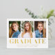 Celebrate your graduate's achievement with this stylish and modern graduation announcement, featuring three personal photos framed in crisp white with "Graduate" displayed in bold gold foil lettering. This elegant multi-photo graduation announcement allows you to customise the front with the graduate's name, school name, and graduation year for a personalised touch. Perfect for both high school and college graduates, this gold foil graduation announcement adds a sophisticated shine to your big announcement, making it a keepsake to cherish for years to come.