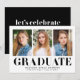 Invite guests to your party with our stylish Simply Bold coral graduation party invites! The modern graduation party invites display three of your favorite photos with "Graduate" below in a black modern font style and the graduate's name, school name & graduation year. The back displays your graduation party details below the phrase "let's celebrate" with a solid black background.