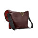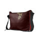 This delicate design of two hearts joined in a simple tree of life is a symbol of love and celebration. Soft, pale green leaves and pretty red hearts on a deep reddish brown background and red bag.