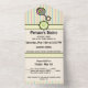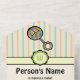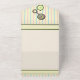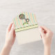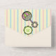 This all-in-one invitation with removable RSVP card features a background of stripes in soft yellow, blue, and pink. Layered on top of this pattern are panels of cream with a green-edged ribbon to provide a base for sample text on the interior that can be customised for your event and blank space on the exterior that can be used for addressing the cards to the recipient and the returnable section with the appropriate return address. Finally a sweet and colourful rattle, decorated with circus-inspired pink and green dotted segments and blue and orange latticework on the main body, yellow polka dots on the purple handle, and brightly coloured segments like stained glass on the flower shaped grip, sits on the flaps with a sample initial inside a green bordered flower to add a final custom touch. Be sure to check out the full Simply Sweet Rattle collection for more great gifts and products for a baby shower or the little one in your life.