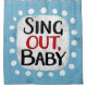 "Sing Out, Baby" is a cute text design in light blue with black and red text, along with a white accent shape and white textured whimsical dots surrounding it.