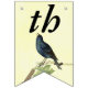 This flag shaped bunting Happy Birthday banner is a light yellow with a pretty elegant singing black bird standing on a branch with leaves with a caterpillar beside him. Customise the birthday year with the templates.