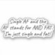 Show off your confidence and sense of humour with this bold sticker that says "Single AF and the AF stands for AND FAT. I'm just single and fat!" Perfect for laptops, water bottles, notebooks, or any place you want to spread body-positive vibes with a touch of sass. Great as a gift for friends who love a good laugh and proudly embrace who they are.