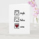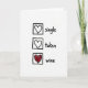 This card shows a funny checklist about relationship status, set on a plain white background. There are three rows, each with a small black square checkbox that has a heart inside it. Next to the boxes, the words “single,” “taken,” and “wine” are written in simple black handwriting, lined up down the page. The hearts beside “single” and “taken” are just black outlines, like they haven’t been chosen. The heart beside “wine” is filled in with a dark red color, and the red ink goes a little outside the heart, like it was colored in quickly. That one red heart makes the joke clear and gives the card a flirty, self-loving feel 💘😘.