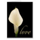 Single white wedding calla lily against a dramatic black background with love in gold script font. Simple - elegant.