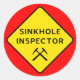 Sinkhole Inspector - bright red sticker with yellow diamond warning style design and crossed rock hammers graphic.