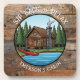 Cute personalized log cabin coasters. A cute cartoon log cabin, pine trees, cabin and lake. IF you have a lake house, log cabin, hunting or fishing cabin then these personalize coasters are a great gift!