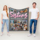 Personalised sister fleecy blanket featuring a trendy grey background that can be changed to any colour, the word "sisters" in a cute pink gradient script font, a sibling quote, your names, and a 20 square photo collage template for you to customise to your own.