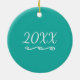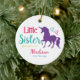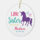 Sisters Colourful Unicorn Little Sister Personalised Christmas Ornament. Personalise this adorable ornament with name underneath a beautiful purple unicorn silhouette. Text in hot pink and turquoise reads LITTLE SISTER with pretty hearts in blue and pink and underlined in curling lines of blue and yellow. Back of ornament has place for the year. Pretty colourful unicorn themed holiday ornament. Customise to change turquoise background on back to any other colour. Coordinate with other sibling gifts. Unicorn Christmas Keepsake.