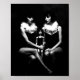 They sit in mirrored poise, bound by threads unseen—two reflections, one hollow stare. Between them, the doll rests, a quiet keeper of secrets too old to name.