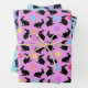 This set of wrapping paper sheets have a repeated image black silhouette bunny rabbits with a pink eyes in a sitting position wearing a ring of colourful flowers on their necks. More flower petals are sprinkled between the rabbits on pastel coloured backgrounds of pink, purple and blue.