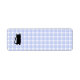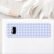 Black cat silhouette on a light blue and white gingham check pattern background.