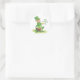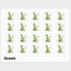 Fun Irish sticker features a Leprechaun sitting on a stump with Shamrocks at his feet. He is dressed in green and is clutching a handful of gold coins.