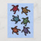 This postcard is light blue with six colourful turtles with abstract markings on their black shells in colours of blue, red, yellow, green, purple, and orange.