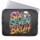 This vibrant, retro-style design features the phrase "SIX SEVEN BRUH" in bold, neon colors with a cool skeleton wearing pink sunglasses. It has a fun, 80s/90s aesthetic, often associated with memes, humor, and a playful attitude. The dynamic typography and bright palette make it perfect for apparel or social media.