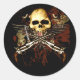 A nod to popular western or gunfighter video games such as Red Dead Redemption and GUN, this design features a skull sans lower jaw over two crossed western style revolvers. Background is an urban or grunge theme.