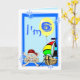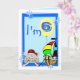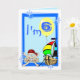 6th birthday card with funny pirate and ship, clown, penguin and balloons, on a blue background. Easily personalize this design by adding or changing the text.