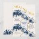 60th birthday party invitation with blue roses. golden arches and lettering. The design is titled "Sixty and Sassy" in gold, art decor style lettering and the template is set up for you to add your custom invite wording. This pretty floral has modern gold arch design and garlands of flower buds, rose blooms and foliage in shades of blue and sand. Perfect for a surprise birthday bash, birthday lunch, garden tea party, spring summer or floral themed 60th birthday celebration!