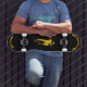 A yellow image of a young skateboarder doing some trick on a board, presumably unsuccessfully a yellow colour template text "Skate Hard Or Go Home", and a template name. Black background. Customisable. You can change the image, and you can change or delete two template texts independantly. To change the background, the colour and position of the text, to change the type of the font, please, use the "Edit Design" button or "Click to customise further" link under "Personalise this template" option. Elegant skateboard for your outdoor activity.