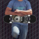 The skateboard has a design characterized by the representation of a sturdy Siberian dog Husky. The skateboard displays the illustration that captures the distinctive appearance of this dog breed, known for its dense fur, pointed ears, and athletic appearance. The design aims to convey the strength and resistance associated with the image of a Siberian Husky, adding a unique and striking touch to the overall look of the skateboard.