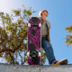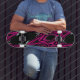 This quality made skateboard is shown with a abstract art pattern print in colours of black, grey and pink.