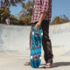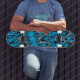 This quality made skateboard is shown with a abstract art pattern print in colours of blue, black, grey.