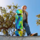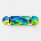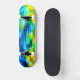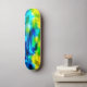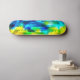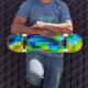 This quality made skateboard is shown with a abstract art pattern print in colours of blue, green and yellow.
