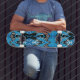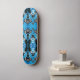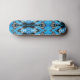 This quality made skateboard is shown with a abstract art pattern print in colours of grey, blue and black.