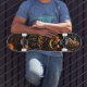 The skateboard has a peculiar and striking design, representing a horrific pumpkin ghost. This skateboard presents an illustration that combines elements of a ghost and a pumpkin in a way that suggests a scary or frightening look. The combination of the word "horrific" indicates that the design is intended to convey a sense of fear or scare, which can be intriguing and attractive to those who are looking for something unique and distinctive on their skating equipment. In short, it's a skateboard with a themed design that merges the figure of a phantom in the shape of a pumpkin, generating a striking and perhaps a bit sinister visual aesthetics.