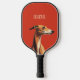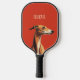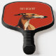 This is a minimalist pickleball paddle design featuring a brown greyhound illustration against vivid red background and a customisable text "delicate".