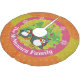 Beautiful Christmas holiday tree skirt features two adorable penguins in ice skates, striped scarves, and winter hats and three decorated Christmas trees on a background of orange and mustard with polka dots, a ring of solid pink with white snowflakes, and a centre of mustard with little white polka dots. You can easily customise this festive holiday tree skirt with your family name!