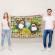Beautiful Christmas holiday throw blanket features two adorable penguins in ice skates, striped scarves, and winter hats and decorated Christmas trees on a background of brown, cream, aqua, orange, and mustard argyle and an aqua blue centre with white polka dots and snowflakes. You can easily personalise with your family name!